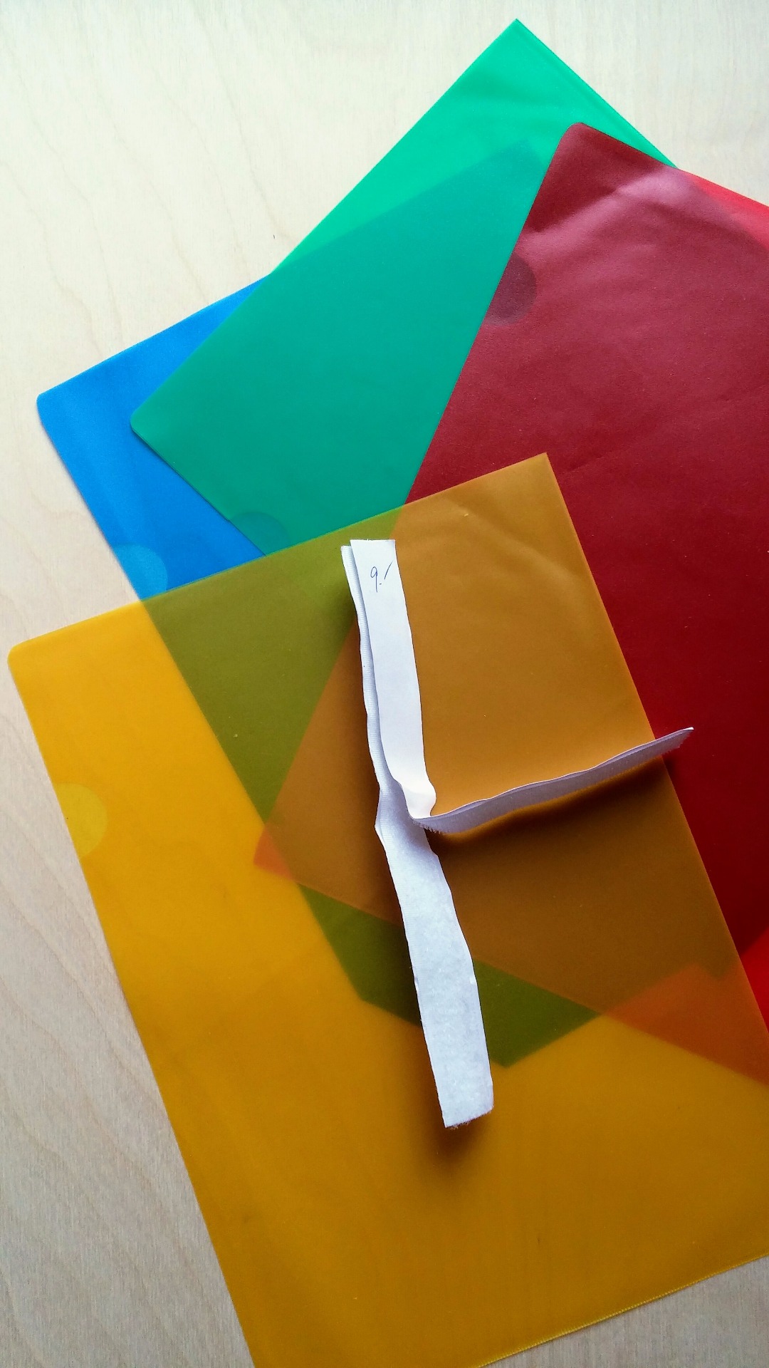Na tuto hru potřebujete složky tenčí gramáže (barevné eurosložky), nastříhejte libovolné pruhy a přikládejte si je před oči.